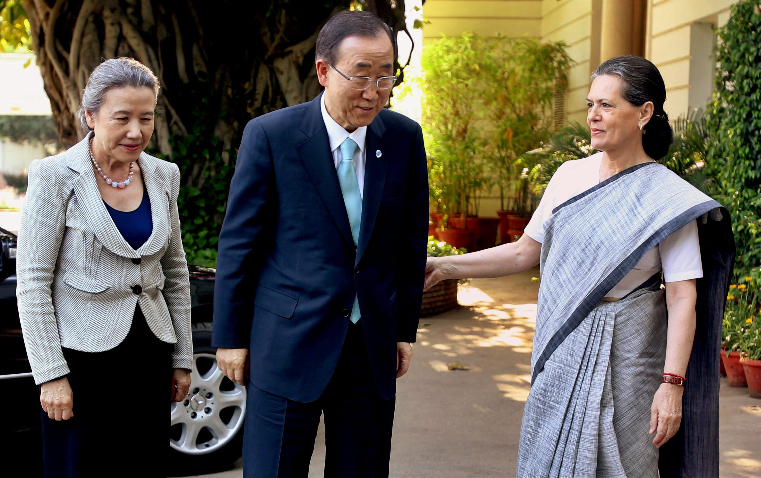 Sonia Gandhi (right), Congress party president and chairperson of the ruling Indian United Progressive Alliance coalition, receiving UN Secretary General Ban Ki-moon and his wife Yoo Soon-taek prior to a meeting at her residence in New Delhi on Friday. Ban is now in India on a four-day visit. PTI Photo