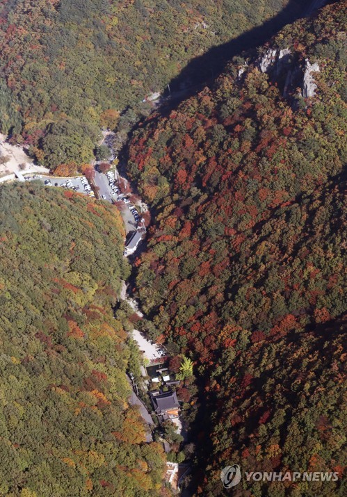 This aerial photo, taken on Nov. 1, 2017, shows the area around Mount Daeun awash with colors of red and yellow as autumn foliage blooms in the southeastern city of Ulsan. (Yonhap) (END)