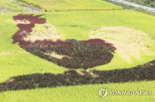 An overhead view of a rice field in Goesan, North Chungcheong Province, on Sept. 27, 2017, shows an image of a chicken made with colored crops. The Goesan County has been embedding images on its farms since 2008 by planting colored rice seedlings. (Yonhap) (END)