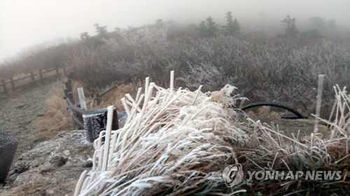 This photo provided by the office of Mount Seorak on Oct. 23, 2017, shows the season's first hoarfrost on grass on the scenic mountain on the east coast. The day is called "sanggang," one of the 24 seasonal divisions of the lunar calendar when frost starts to form. (Yonhap) (END)