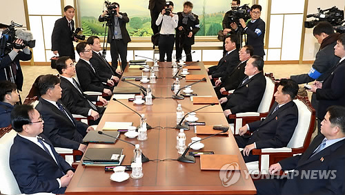 South Korean delegates (L) and their North Korean counterparts hold high-level talks at the border village of Panmunjom on Jan. 9, 2018. The meeting is meant to discuss Pyongyang's possible participation in the Feb. 9-25 PyeongChang Winter Olympics and ways to improve their long-stalled ties. (pool photo) (Yonhap) (END)