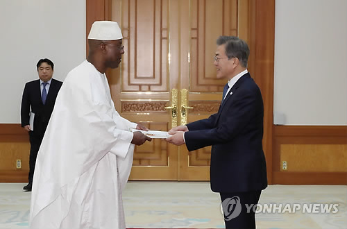 Politics South Korean President Moon Jae-in (R) receives credentials from new Senegalese Ambassador to Seoul Mamadou Gueye Fayeo at the presidential office Cheong Wa Dae on Jan. 31, 2018. (Yonhap) (END) Log in to post comments
