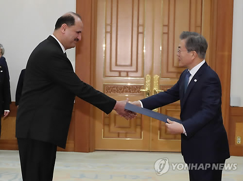 South Korean President Moon Jae-in (R) shakes hands with new Egyptian Ambassador to Seoul Hazem Fahmy after receiving credentials from him at the presidential office Cheong Wa Dae on Jan. 31, 2018. (Yonhap) (END)