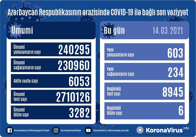 603 new cases of coronavirus infection have been recorded in Azerbaijan, while 234 patients have been recovered, the Task Force under the Cabinet of Ministers told AZERTAC.