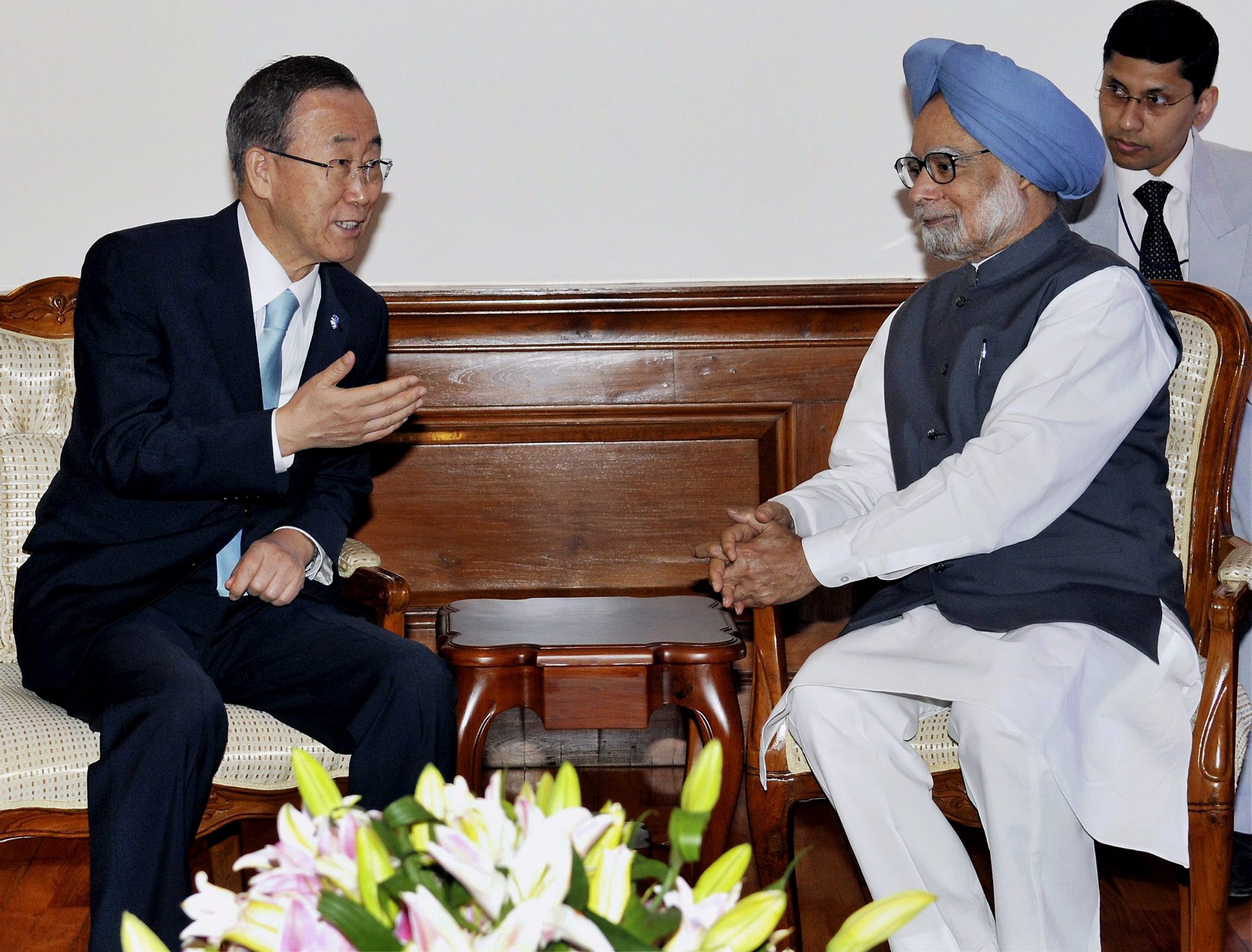 New Delhi, Apr 27 (PTI) UN Secretary General Ban Ki Moon today met India's Prime Minister Manmohan Singh and lauded the country's efforts on public health and sustainable development. Ban, who is on a four-day visit, met Singh at his residence and the two are believed to have discussed a host of issues, both regional and global. During the meeting, the UN chief lauded India's efforts on public health and sustainable development, the Prime Minister's Office said. Soon after his arrival yesterday, Ban had commended India's success in combating polio. He had said the UN would wish to help India in dealing with polio, malaria, tetanus, measles and HIV transmission related mortality. PTI Caption for pic: Prime Minister Manmohan Singh and UN Secretary General Ban Ki-moon at a meeting in New Delhi on Friday. PTI Photo