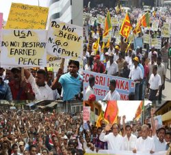 New Delhi, Feb 28, IRNA -- Several thousands of government supporters chanting 'hands off Lanka' Monday took to streets across Sri Lanka against US-sponsored resolution that censured Sri Lanka over alleged war crimes during battle against Liberation Tigers of Tamil Eelam (LTTE). Protests were held throughout the island slamming the US move at the UN Human Rights Council as interference in Sri Lanka's internal affairs. A large gathering walked to the US embassy to handover a communique amidst chants of 'hands off Lanka'. 'US, Don't Support Terrorism,' read a placard carried by a protester. Activists also carried photographs of President Mahinda Rajapakse and his defense secretary brother, Gotabhaya Rajapakse, who spearheaded the military campaign that crushed Tamil rebels in May 2009 after nearly 37 years of fighting. A group of lawyers representing the ruling party also handed over a communique to UN Colombo offices. 'We pointed out that US action was a violation of Sri Lanka's sovereignty,' pti reported quoting P D Mendis, a spokesman for the group as said. Traffic was halted as large numbers of government protesters carrying national flags thronged the main business centre of Fort to condemn the US and the West for acting to undermine Sri Lanka. The US-sponsored resolution is to urge Sri Lanka to implement the recommendations of the Lessons Learnt and Reconciliation Commission (LLRC). Sri Lanka has dubbed the resolution as unwarranted in the light of action already taken to implement the recommendations. The country's rights' record during the final battle with the LTTE was called into question by an expert panel of UN chief Ban Ki Moon./end