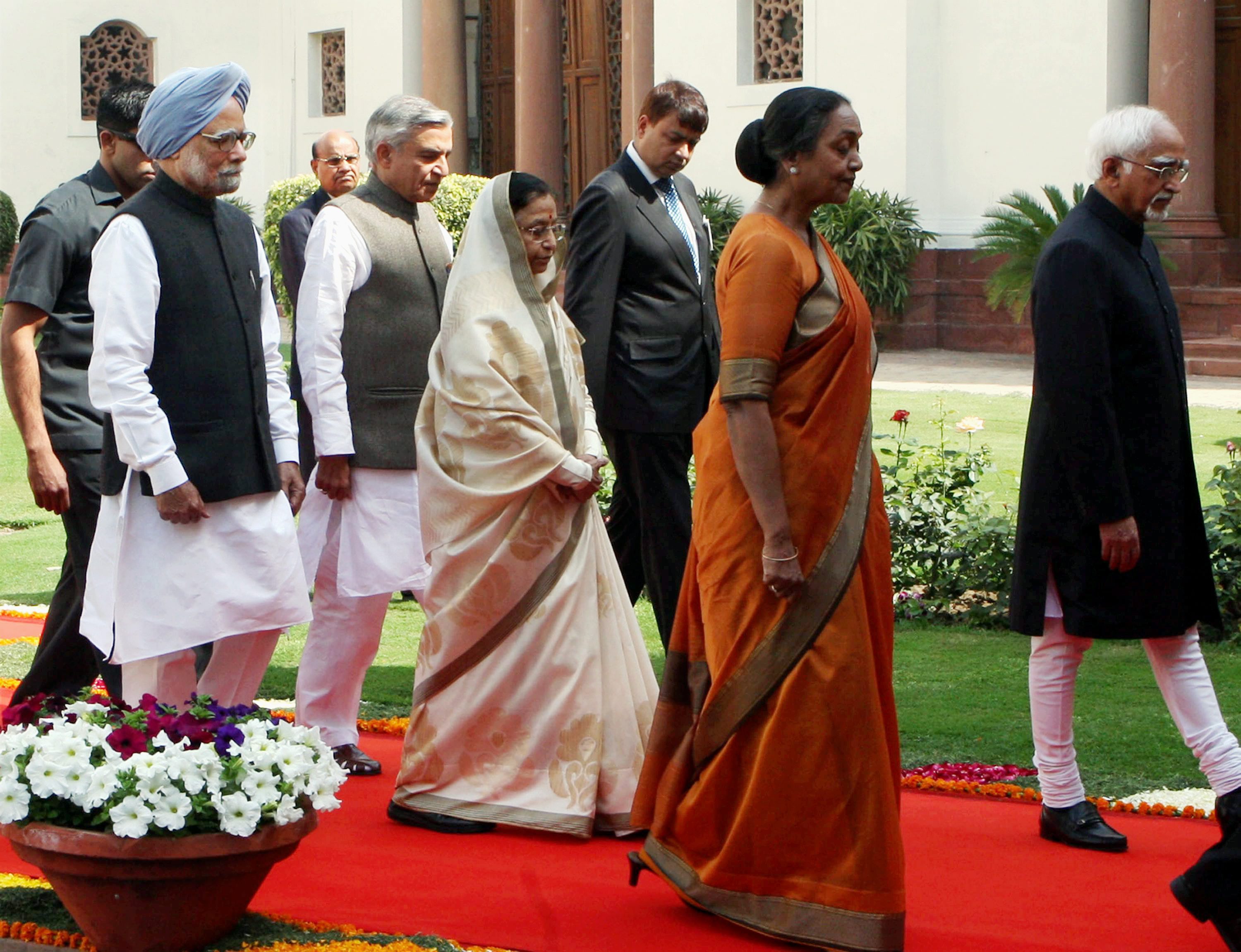 India's President Mrs Pratibha Patil (centre), accompanied by Vice President and Chairman of Rajya Sabha (upper house of Parliament) Hamid Ansari (right), Prime Minister Manmohan Singh (left), Lok Sabha Speaker Meira Kumar (2nd right) and Parliamentary Affairs Minister Pawan K Bansal (besides Singh) proceeds to address a joint sitting of Parliament to mark the beginning of the annual Budget session, in New Delhi on Monday. PTI Photo