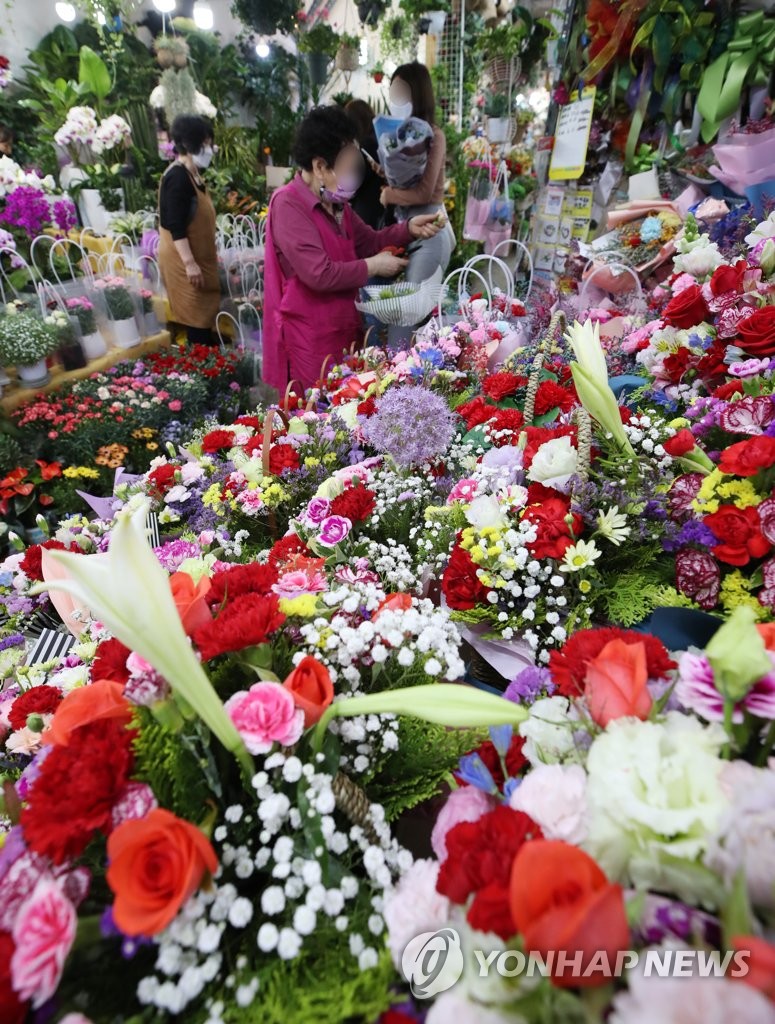 Citizens buy carnations for their parents at a flower market in Seoul on May 6, 2021, two days ahead of Parents' Day. (PHOTO NOT FOR SALE) (Yonhap)