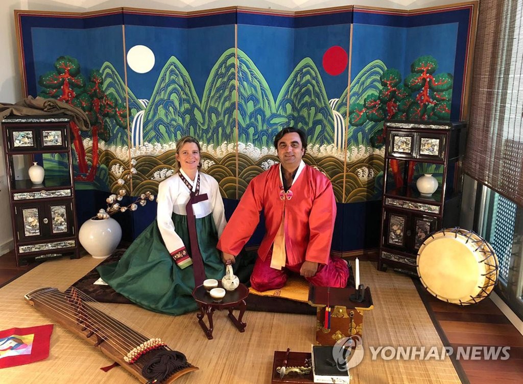 This photo, provided by the Korea Tourism Organization, shows a Spanish couple dressed in hanbok, traditional Korean costume, experiencing Korean culture in Madrid during the Korea Tourism Week in Spain from Oct. 14-21, 2021. (PHOTO NOT FOR SALE) (Yonhap)