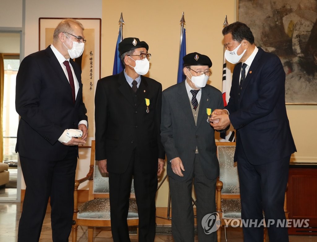 French Ambassador to South Korea Philippe Lefort (L) and South Korean veteran affairs minister Hwang Ki-chul (R) speak with Korean War veterans Park Dong-ha (2nd from L) and Park Mun-joon after awarding them with a military decoration from France at the French Embassy in Seoul on March 11, 2021. The two veterans were in a French battalion of the United Nations forces during the 1950-53 Korean War. (Yonhap)