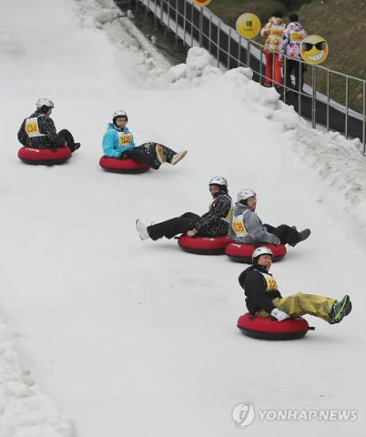 Tourists from Southeast Asian nations enjoy sledding at Yongpyong Ski Resort in Gangwon Province on April 13, 2014, during April Snow Festival, which is sponsored by the Korea Tourism Organization.