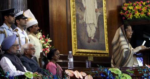 India's President Mrs Pratibha Patil (centre), accompanied by Vice President and Chairman of Rajya Sabha (upper house of Parliament) Hamid Ansari (right), Prime Minister Manmohan Singh (left), Lok