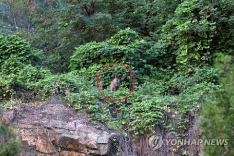 A long-tailed goral, one of the most endangered species in South Korea, appears in Yongma Falls Park in Jungrang-gu, Seoul, in this photo provided by the Ministry of Environment on July 22, 2018.