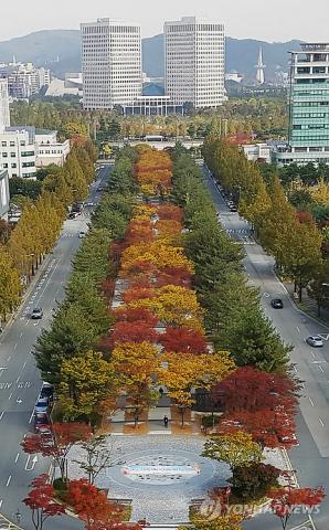 This photo taken Oct. 24, 2017, shows street trees in front of the city hall of Daejeon, about 160 kilometers south of Seoul, turning red and yellow as autumn deepens. (Yonhap) (END)