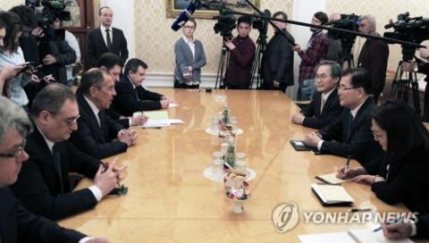 South Korea's National Security Office chief Chung Eui-yong (2nd from R) talks with Russian Foreign Minister Sergei Lavrov (3rd from L) during their meeting in Moscow on March 13, 2018.