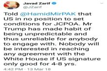 TEHRAN, Mar. 14 (MNA) – Iranian Foreign Minister Moammad Javad Zarif who is visiting Pakistan on a three day trip, arrived in Pakistani port city of Karachi on Tues.