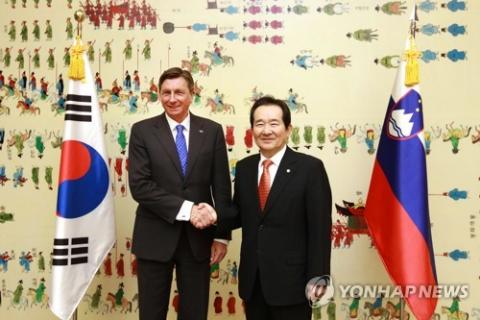 National Assembly Speaker Chung Sye-kyun (R) meets Slovenian President Borut Pahor, who is visiting South Korea for the PyeongChang Winter Olympics, at the parliament in Seoul on Feb. 19, 2018.