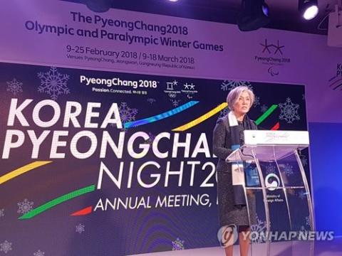 South Korean Foreign Minister Kang Kyung-wha speaks at the Korea PyeongChang Night to mark the upcoming PyeongChang Winter Olympics and Paralympics in Davos, Switzerland, on Jan. 25, 2018.