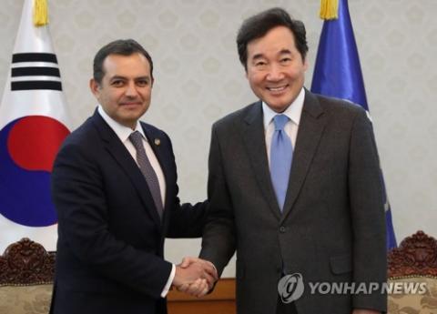 South Korean Prime Minister Lee Nak-yon (R) poses for a photo with President of the Mexican Senate Ernesto Cordero Arroyov during their meeting at the government complex in Seoul on Jan. 22, 2018.