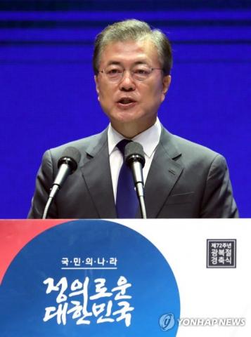 President Moon Jae-in delivers a speech at a ceremony marking the 72nd anniversary of the country's liberation from the 1910-1945 Japanese colonial rule on Aug.