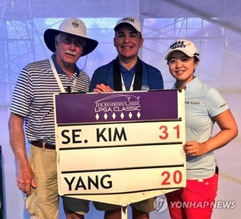 Kim Sei-young (R) poses with a board showing the record 31-under 257 she scored at the Thornberry Creek LPGA Classic golf tournament on July 8, 2018, in Oneida, Wisconsin, in the United States, in