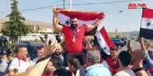 Damascus, SANA- Syrian champion weightlifter Ma’an Asaad, who gained the bronze medal in the weightlifting competition for over 109 kg at the Tokyo Olympics, , receives warm welcome at Jdeidet Yabo