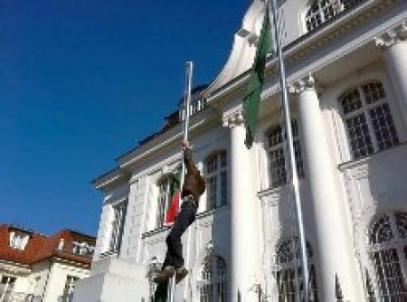 Pretending to be pro-Qaddafi supporters, two protesters entered the diplomatic compound and tore down the official flag of Libya, replacing it with the old royal flag of Libya amid cheers by dozens of pro-democracy demonstrators who had gathered outside the embassy in Berlin's upscale Dahlem district.