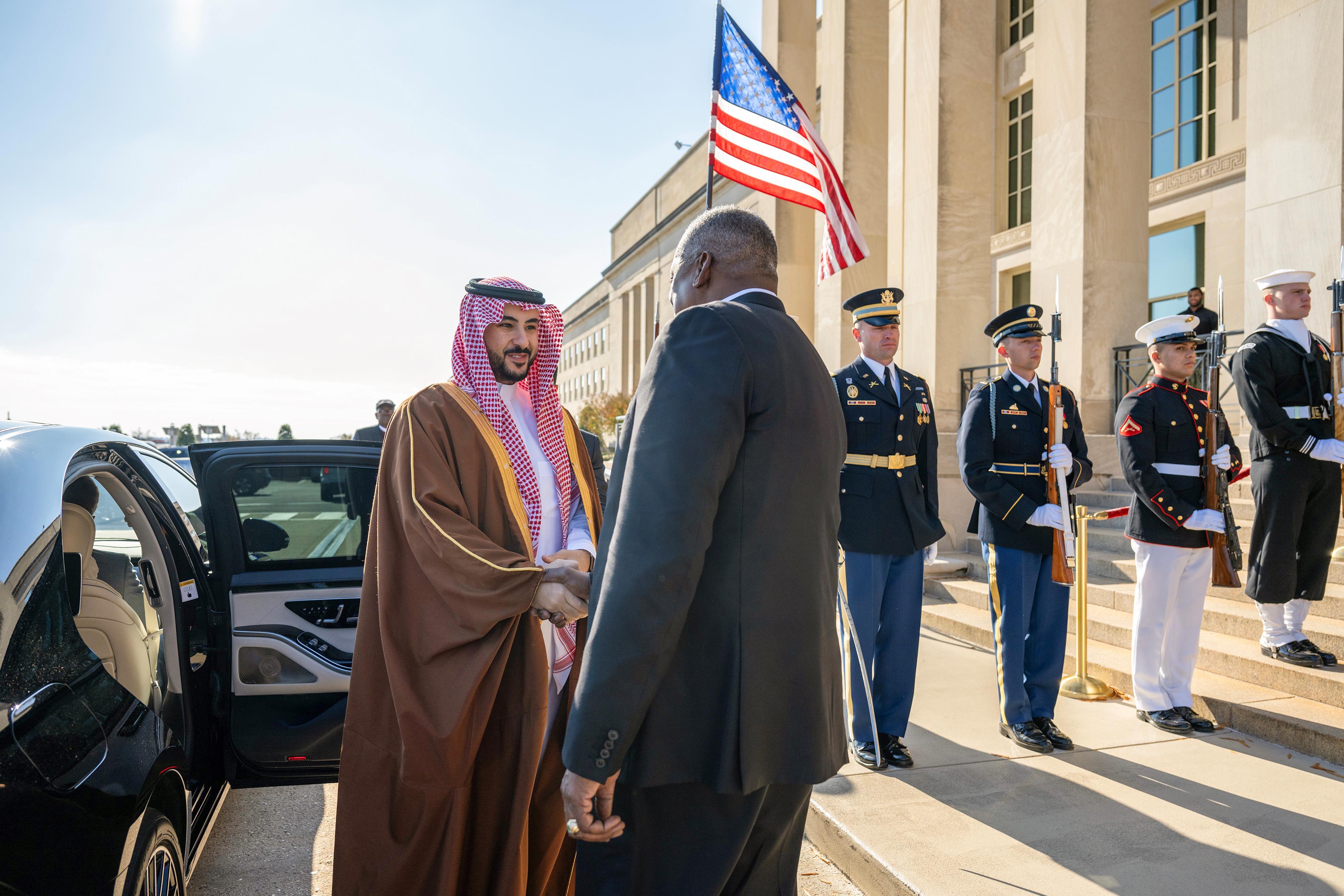Washington, November 01, 2023, SPA -- The U.S. Secretary of Defence Lloyd Austin received the Minister of Defence, Prince Khalid bin Salman bin Abdulaziz, today at the headquarters of the U.S. Department of Defence in Washington.