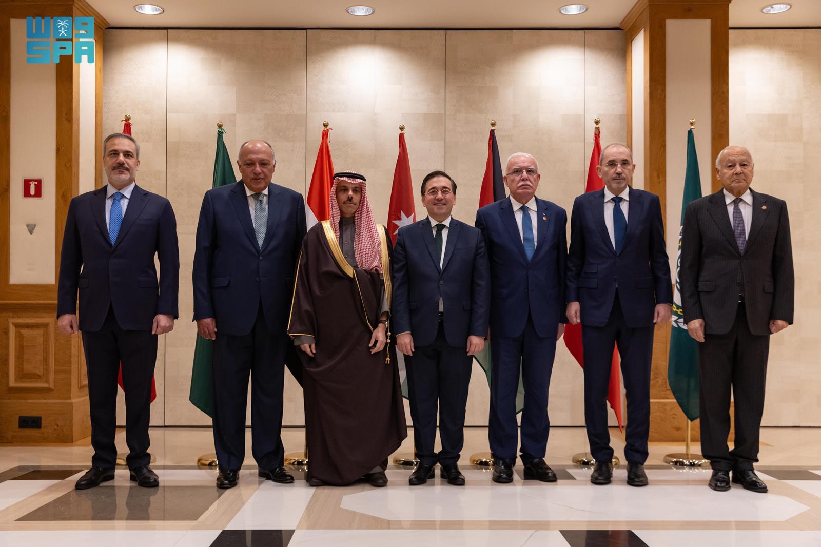 Barcelona, November 27, 2023, SPA -- Members of the Ministerial Committee assigned by the Joint Arab-Islamic Extraordinary Summit under the chairmanship of Minister of Foreign Affairs of the Kingdom of Saudi Arabia Prince Faisal bin Farhan bin Abdullah met today with Minister of Foreign Affairs, European Union, and Cooperation of Spain, José Manuel Albares Bueno, in Barcelona.