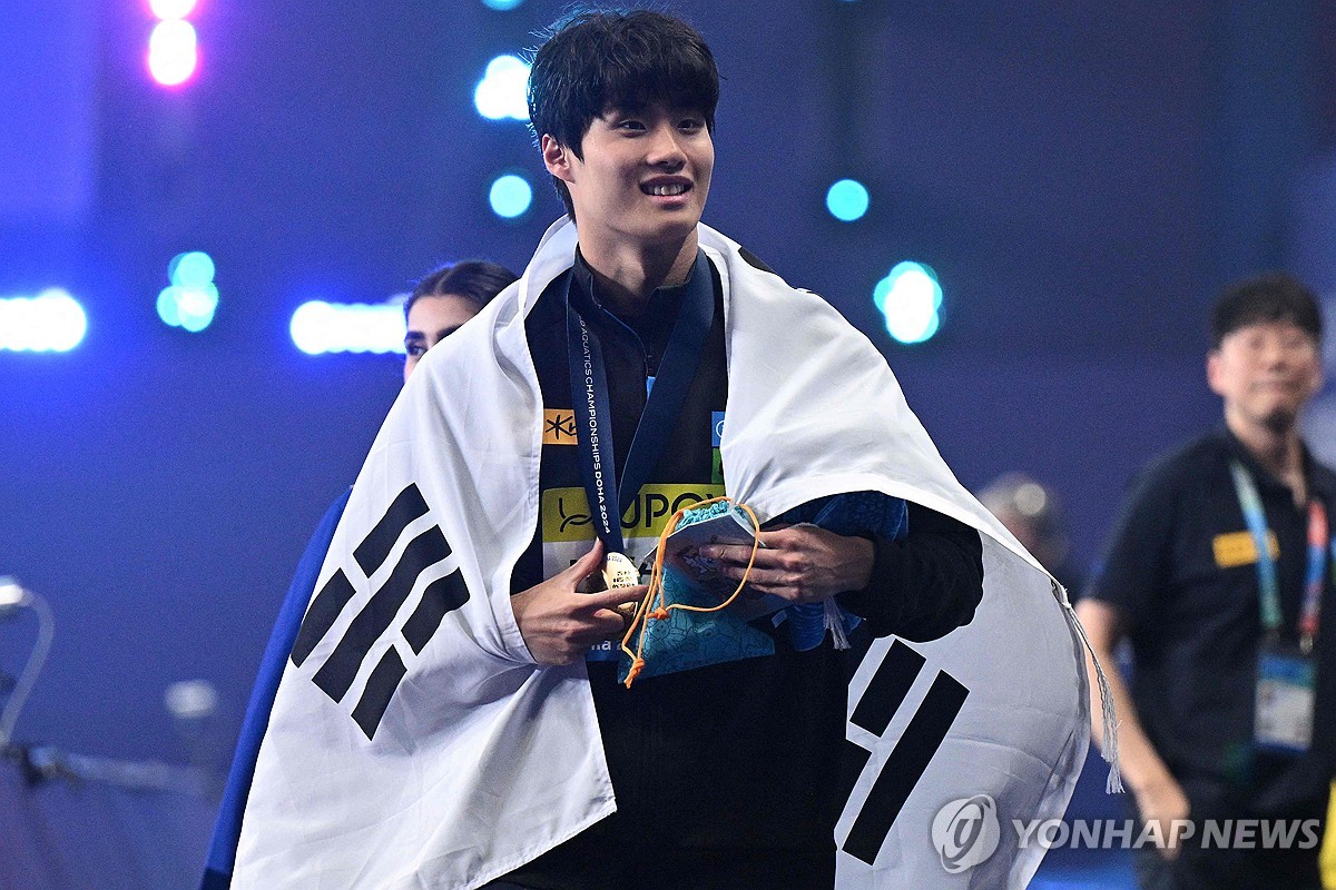 Hwang won the men's 200-meter freestyle gold medal at the World Aquatics Championships in Doha on Tuesday (local time). He finished the race at the Aspire Dome in 1:44.75, with Danas Rapsys of Lithuania taking the silver in 1:45.05. Luke Hobson of the United States finished third in 1:45.26.