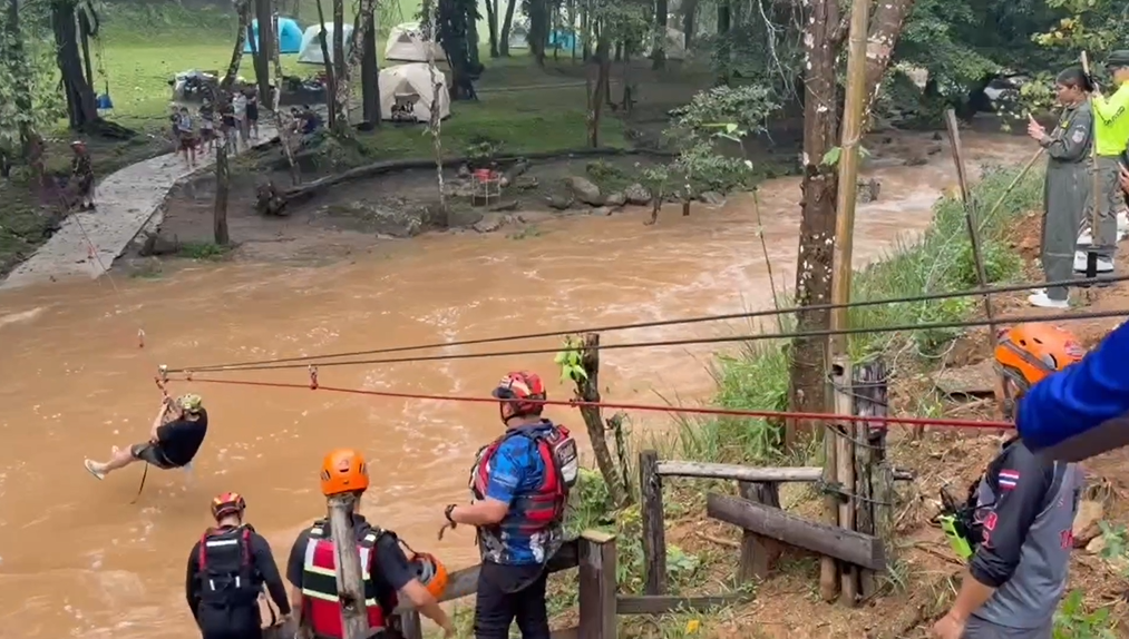 Continuous heavy rainfall battered the area, causing a sudden and rapid surge of water at Mae Tia Waterfall inside Ob Luang National Park. The swift and intense current trapped 25 tourists who were camping near the site.