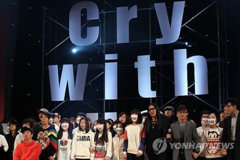 A group of entertainers and former North Korean defectors, who are attending a South Korean school, sing the song "Cry with Us" during a concert at Seoul's Yonsei University on March 4, 2012, in a