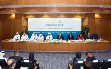 Manama, Mar. 29 (BNA): Ahli United Bank (AUB) B.S.C today held its Annual General Meeting and the Extraordinary General Meeting at the Bank's headquarters in Seef District, Kingdom of Bahrain. The meetings were presided over by AUB’s Chairman Mr. Hamad M. Al-Humaidhi and were attended by shareholders representing 81% of Bank's shares.