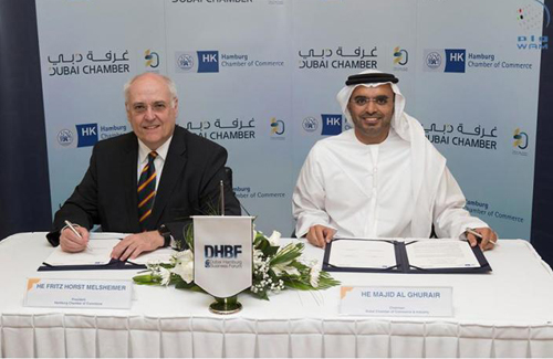 The MoU was signed during the 5th Dubai Hamburg Business Forum organised in Dubai by Dubai Chamber of Commerce and Industry on March 22nd, 2016, in the presence of Majid Al Ghurair, Chairman of Dubai Chamber, Hamad Buamim, President and CEO of Dubai Chamber, and Fritz Horst Melsheimer, President of Hamburg Chamber of Commerce.