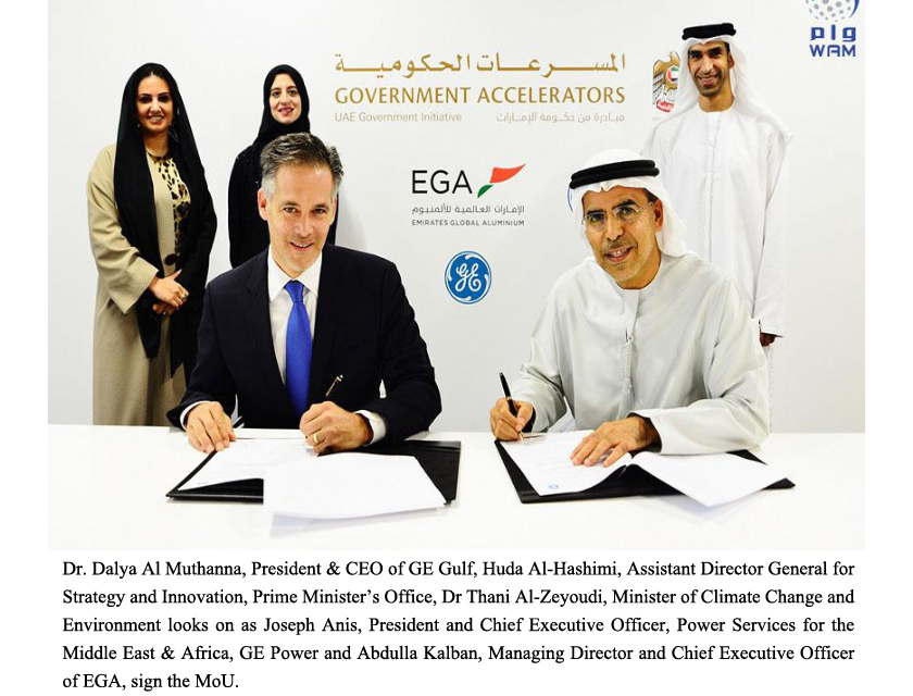 DUBAI, 22nd December, 2016 (WAM) -- Emirates Global Aluminium, EGA, and GE Power yesterday signed a Memorandum of Understanding, MoU, to work together on a 100-day programme to reduce EGA’s nitrogen oxide (NOx) emissions under the UAE Government Accelerators programme.