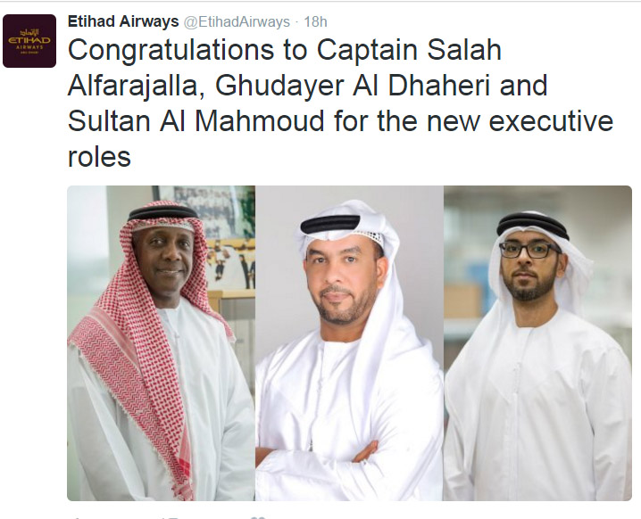 Captain Salah Alfarajalla, who has been with Etihad Airways since 2007, becomes Senior Vice President Security and National Pilot Development, Ghudayer Al Dhaheri, who joined the airline in 2013, becomes Vice President Corporate Security, and Sultan Mohamed Al Mahmoud joins the airline as Vice President Corporate Strategy.