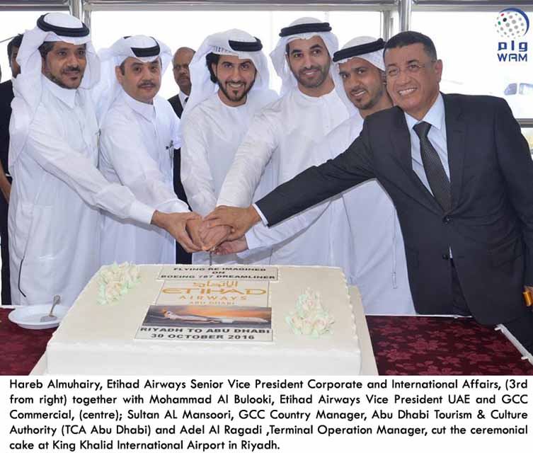 RIYADH, 31st October 2016 (WAM) – Etihad Airways’ latest Boeing 787 Dreamliner route was launched yesterday with the state-of-the art aircraft touching down in Riyadh, capital of the Kingdom of Saudi Arabia. The occasion was marked with an official welcome ceremony attended by the airline’s senior management led by Hareb Almuhairy, Etihad Airways Senior Vice President Corporate and International Affairs, together with Mohammad Al Bulooki, Etihad Airways Vice President UAE and GCC Commercial, Sultan AL Mansoori, GCC Country Manager, Abu Dhabi Tourism & Culture Authority (TCA Abu Dhabi) and Adel Al Ragadi ,Terminal Operation Manager, King Khalid International Airport in Riyadh. The Dreamliner offers more seats and features the airline’s award-winning interiors in a two-class configuration – 28 Business Studios, each providing aisle access and equipped with an in-seat massage and air cushion control system, and 271 Economy Smart Seats with unique ‘fixed wing’ headrests. The aircraft operates on one of the twice-daily flights between Abu Dhabi International Airport and Khalid International Airport. Mohammad Al Bulooki, Etihad Airways Vice President UAE and GCC Commercial, said: "Since its launch in 2004, the route has seen consistently strong passenger growth, and to date, we have carried more than 2.5 million guests between Riyadh and Abu Dhabi. Etihad Airways’ decision to offer additional capacity on this important route will undoubtedly be well received in the market. Linking the two capitals of the UAE and Saudi Arabia, with the Boeing 787 further underscores the importance of Riyadh and the Kingdom of Saudi Arabia to our operations." Riyadh becomes Etihad Airways’ newest B787 destination this year following the induction of the aircraft on flights to Perth, Dusseldorf and Shanghai, with Abu Dhabi – Johannesburg set to become a Dreamliner route on 1 November. Etihad Airways’ current fleet of nine B787s also operates to Singapore, Washington DC, Brisbane and Zurich. Etihad Airways’ flights to Riyadh, Jeddah, Medina and Dammam are complemented by Saudi codeshare partner flynas, whose dedicated services between Abu Dhabi and both Riyadh and Jeddah provide travellers with even more choice. - Emirates News Agency, WAM -http://www.wam.ae/en/news/emirates-arab-international/1395302010788.html
