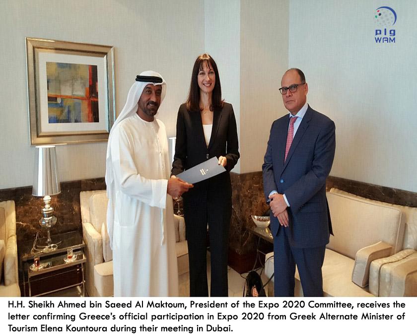 The letter was delivered to HH Sheikh Ahmed bin Saeed Al Maktoum, President of the Expo 2020 Committee, by Greek Alternate Minister of Tourism Elena Kountoura, who met with Sheikh Ahmed as part of a series of meetings with UAE ministers, including Sultan bin Saeed Al Mansouri, Minister of Economy.