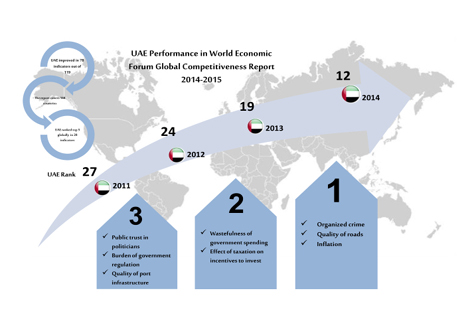 His Highness’s comments came in the wake of the results of the Global Competitiveness Report issued by the World Economic Forum in 2014- 2015 in which the U.A.E. advances 7 places in the overall competitiveness of its economy within just one year, becoming the 12th most competitive nation globally, ahead of countries such as Denmark, Canada and South Korea. The U.A.E. impressively leads globally in a number of indicators: 1st globally in quality of the roads and the absence of organised crime, 1st globally for having the lowest rate of inflation, 2nd globally for government procurement of advanced technology, 2nd globally for the effectiveness of government spending, and the impact of taxes on investment and the lack of trade barriers; it also ranks 2nd for the quality of its infrastructure in the aviation sector. The U.A.E. also came in 3rd place globally on indicators such as citizens' confidence in government and leadership, the absence of government bureaucracy, the quality of ports, efficiency of customs procedures, attracting technology through foreign direct investment (FDI); Significantly, for the knowledge economy, U.A.E. ranked 3rd globally for attracting professional talent. Overall, the U.A.E. improved its performance in 78 indicators out of 114.
