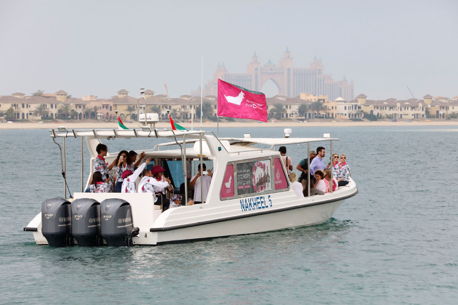 Pink boats provided for the second year in a row by Nakheel Group will set off from two piers, one at the Palm, and the other picking up horse riders after their campaign through the emirate, from Jumeirah Beach Hotel. The two routes, covering the Marina Canal and the Jumeirah Beach Hotel, will merge together at The Palm Dubai.