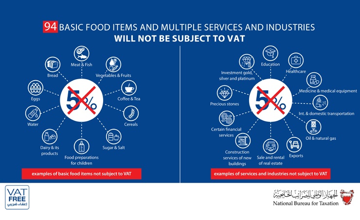 Manama, (BNA): The Minister of Finance and National Economy Shaikh Salman bin Khalifa Al Khalifa affirmed that the Ministry will take all necessary measures to ensure that the Value Added Tax (VAT) is not applied on zero-rated goods and services - 94 basic food items in addition to goods and services that support essential sectors - in line with the VAT Law and its Executive Regulations.