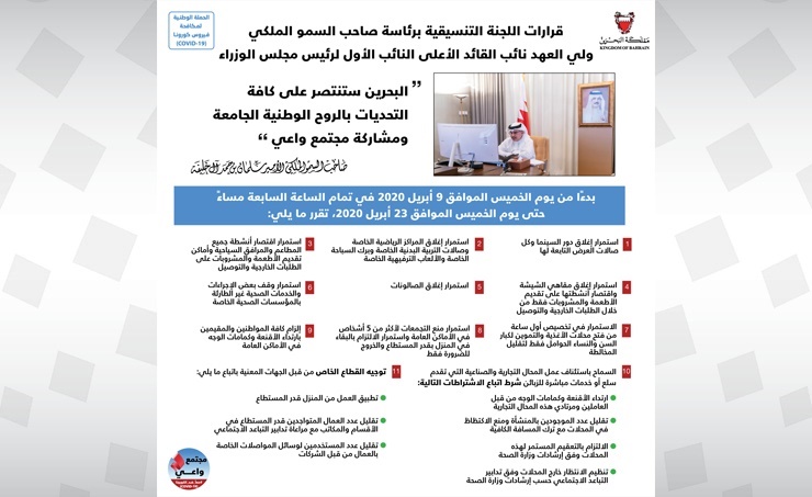 Following the consideration of a report submitted by the National Medical Task Force to Combat the Coronavirus, headed by HE Lieutenant-General Dr. Shaikh Mohammed bin Abdullah Al Khalifa, Chairman of the Supreme Council of Health, the following decisions were taken, effective from 19h00, Thursday 09 April, to Thursday 23 April: