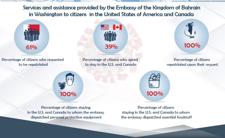 Since the outbreak of the pandemic in the U.S. and Canada, the embassy has been keen to communicate with the citizens who have registered their names through Wejhaty, phone calls to the embassy's emergency line, e-mail, or calls received by the follow-up office at the Ministry of Foreign Affairs in Manama.