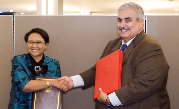 New York, Sept. 26 (BNA): Foreign Affairs Minister Shaikh Khalid bin Ahmed bin Mohammed Al Khalifa met Minister of Foreign Affairs of the Republic of Indonesia, Retno Marsudi, at the United Nations Headquarters in New York. During the meeting, an agreement was signed on the establishment of a joint commission for cooperation between the Kingdom of Bahrain and the Republic of Indonesia, in order to further enhance the friendly cooperation relations between the two countries. The commission will serve as a mechanism to review all aspects of bilateral relations and exchange views on international issues of common concern. Also at the meeting, an agreement was signed between the two countries on mutual exemption of visa requirements for holders of diplomatic, special and service passports. The Minister expressed Bahrain's pride in the friendly relations with the Republic of Indonesia, noting that the agreements signed reflect the keenness of both countries to develop all aspects of bilateral cooperation and joint coordination.