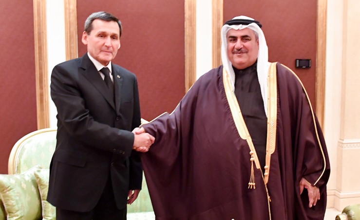 Manama, Mar. 18 (BNA): Foreign Affairs Minister Shaikh Khalid bin Ahmed bin Mohammed Al Khalifa, met Deputy Chairman of the Cabinet of Ministers, Minister of Foreign Affairs of Turkmenistan, Raşit Meredov, on the sidelines of the official visit of His Majesty King Hamad bin Isa Al Khalifa to Turkmenistan.