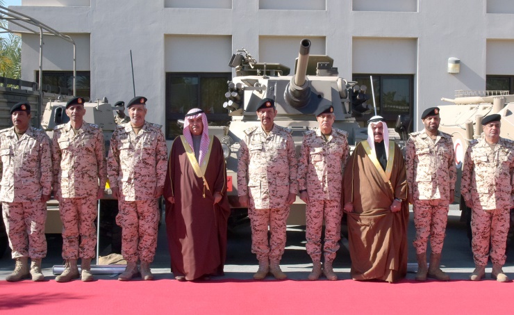 On arrival at the venue of the ceremony, the BDF Commander-in-Chief was welcomed by Defence Minister Lieutenant General Abdullah bin Hassan Al Nuaimi, Chief of Staff Lieutenant General Dhiab bin Saqr Al Nuaimi, Defence Ministry Undersecretary Major General Shaikh Ahmed bin Mohammed Al Khalifa, Royal Shields Commander Major General Rashid Abdullah Al Nuaimi and senior officers.