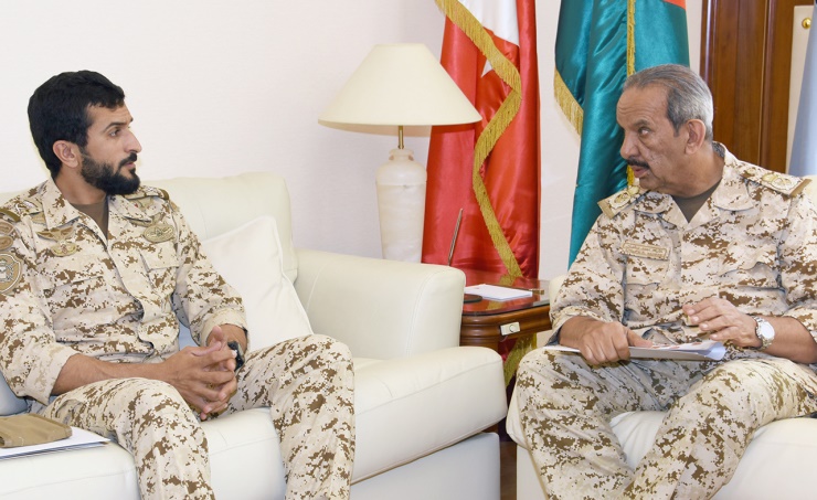 Manama, June 30 (BNA): Commander-in-Chief of Bahrain Defence Force (BDF) Field Marshal Shaikh Khalifa bin Ahmed Al Khalifa received today Commander of the Royal Guard Major General Shaikh Nasser bin Hamad Al Khalifa. He welcomed him, lauding his tireless efforts to achieve more combat and administrative development of the Royal Guard.