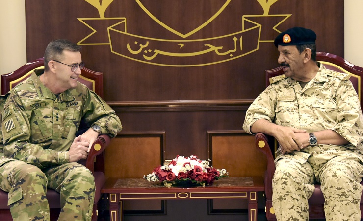 Manama, Sept. 11 (BNA): BDF Commander-in-Chief Field Marshal Shaikh Khalifa bin Ahmed Al Khalifa received Commander of the US Army Central (USARCENT) Command General Terry Ferrell, and the accompanying delegation. The BDF Commander-in-Chief praised the advanced Bahrain-US friendship ties and highlighted means of bolstering them in various arenas especially the military and defence cooperation. Defence Minister General Abdullah bin Hassan Al Nuaimi, BDF Chief-of-Staff Lt-Genral Dhiyab bin Saqer Al Nuaimi, BDF General Command Headquarters Director Major-General Hassan Mohammed Sa'ad, Military Cooperation Director Major-General Mohammed Hashim Al Sada, Assistant Chief of Staff for Operations Major-General Ghanim Ibrahim Al Fadhala, Naval Major-General Mohammed Yousef Al Assam the Commander of the Royal Bahrain Navy Force, and senior officers were also present.