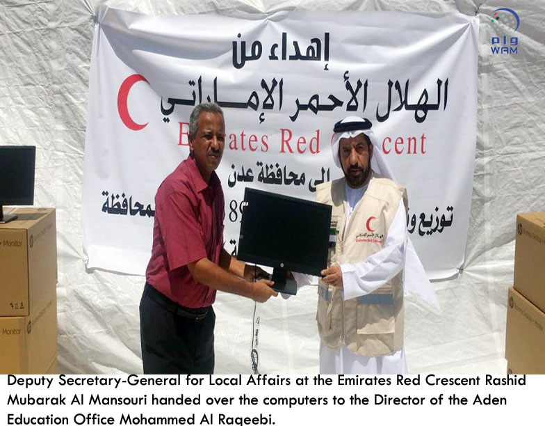 Deputy Secretary-General for Local Affairs at the Emirates Red Crescent Rashid Mubarak Al Mansouri handed over the computers to the Director of the Aden Education Office Mohammed Al Raqeebi.
