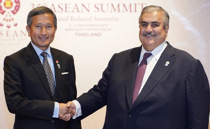 Bangkok, Nov. 3 (BNA): Minister of Foreign Affairs, Shaikh Khalid bin Ahmed bin Mohammed Al Khalifa, met today his Singaporean counterpart, Vivian Balakrishnan, on the sideline of the 35th Summit of the Association of Southeast Asian Nations (ASEAN) here. The Minister of Foreign Affairs hailed the deep-rooted friendly relations between the Kingdom of Bahrain and the Republic of Singapore and the mutual keenest of both sides to enhance existing cooperation and exchange of experiences in various fields, namely diplomats-development field. The Minister also underlined the importance of continuing consultations and coordination on means of enhancing relations for the common interests of the two friendly countries. Mr. Balakrishnan stressed the pride taken by the Republic of Singapore in its distinguished relations with the Kingdom of Bahrain, noting the Kingdom’s role in establishing peace and security in the region. The two sides further discussed recent developments at the regional and international levels.
